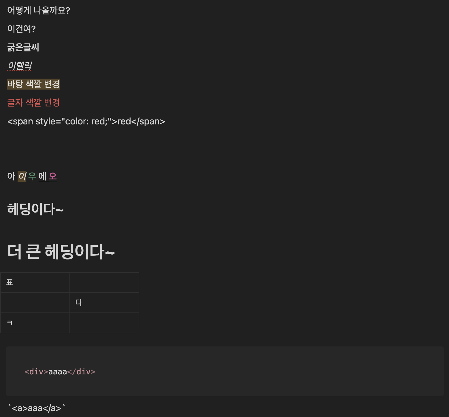 - ๊ธ์ ์์ ๋ณ๊ฒฝ ๋ฑ์ ๋งํฌ๋ค์ด์์ ์ง์ํ์ง ์์ผ๋ฏ๋ก HTML์ผ๋ก ์์ฑํด์ผ ํ๋ค.
